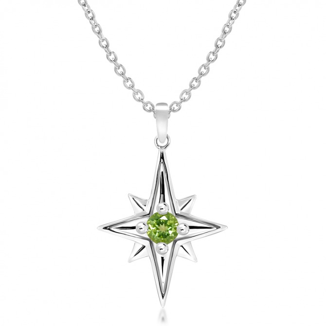 Sterling silver star shaped pendant set with peridot, suspended from an 18" sterling silver chain.