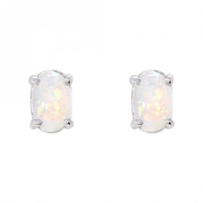 Sterling Silver & Created Opal 6x4mm Oval Claw Set Stud Earrings.