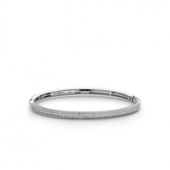 TI SENTO - Milano silver bangle. The bracelet is made of rhodium plated silver and is set on the top edge with white zirconias. The bracelet is an ‘Essentiali’ in your jewellery collection; thanks to its versatility, it’s a must-have in every jewellery box. Wear the bracelet on its own as the eye-catcher of your outfit or combine it with a bead bracelet for a trendy look.