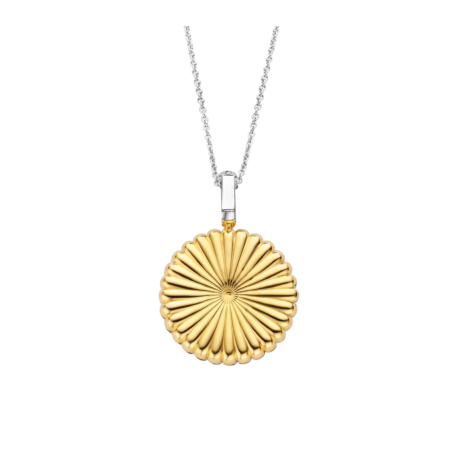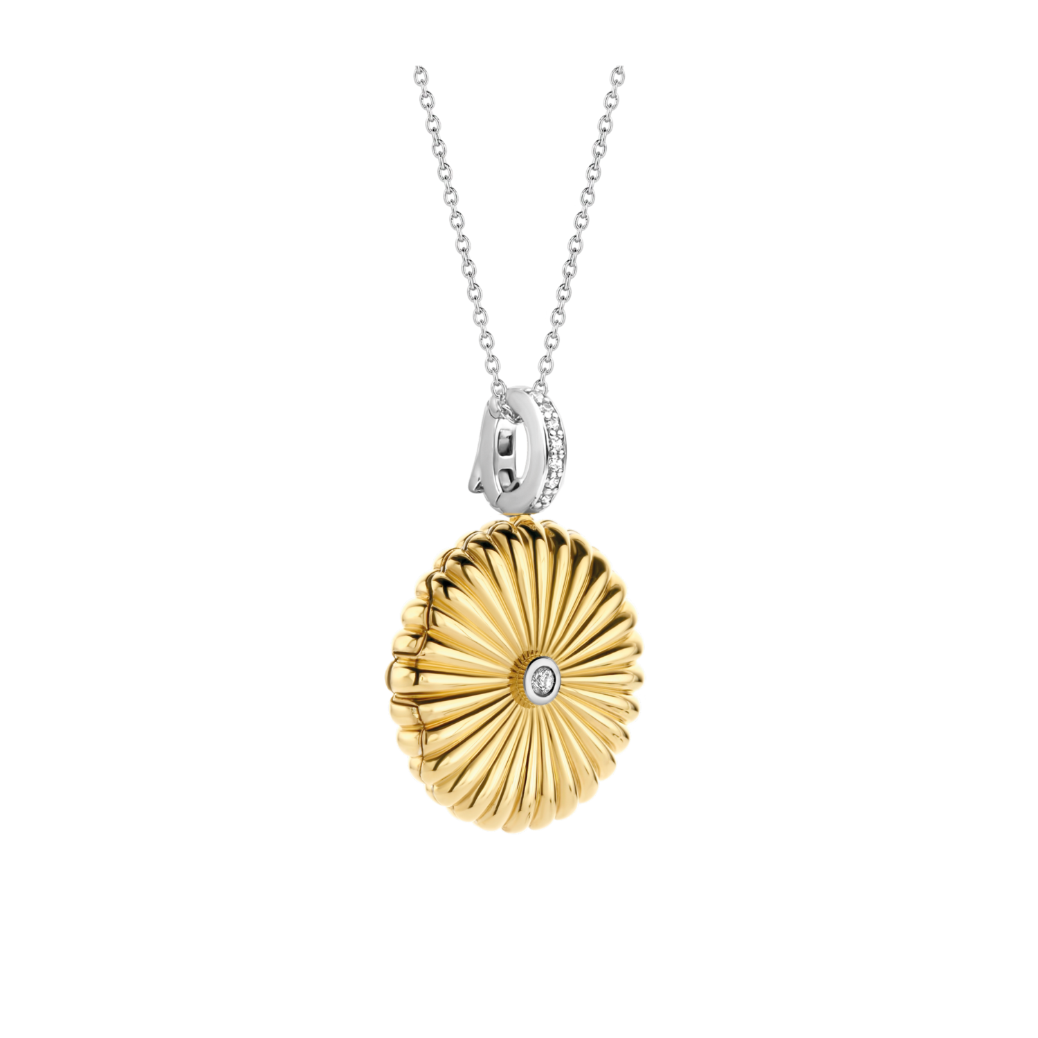 This Ti Sento Milano gold-plated silver locket pendant has a beautiful sun shape with a white cubic zirconia at its centre. Its clip-eye is handset with a pave of shimmering white cubic zirconia. This keepsake was inspired by the rays of sun; carry its warmth with you and radiate it outward. Stow your dearest memories in this beloved open locket.