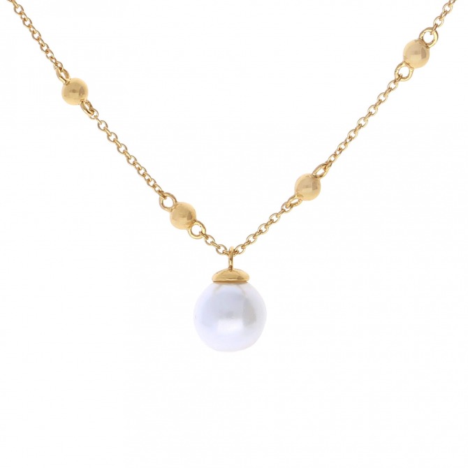 This spectacular station necklace highlights tiny ball sections decorating the chain and a stunning 8mm shell pearl in the centre. Crafted in 24ct yellow gold plated sterling silver, this necklace features an extendable length of 40cm-45cm and is the perfect bridal piece for anyone’s special day! Make sure to pair with the matching earrings and bracelet for a complete style!