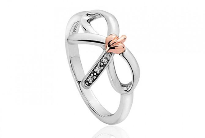 The classical bow motif represented in this stylish ring shares its familiarity with all ages and its heritage with the iconic Tree of Life® design of natural intertwining vines & leaves, delicately combined. This elegant, contemporary silver and rose gold ring, available in sizes J-T, is set with three diamonds, is the perfect accessory to complement any outfit for any occasion. Classic design never dates. Matching items are available.
