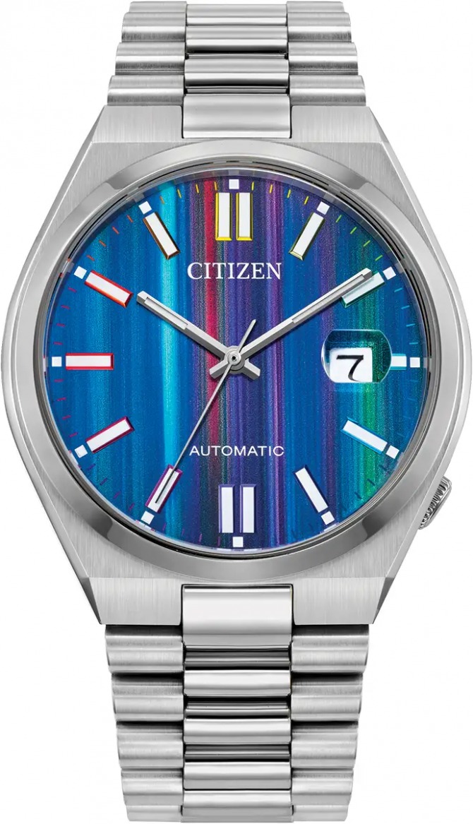 The "Tsuyosa" Automatic, from the NJ015 series, brings ultramodern sports styling to your wrist. The sophisticated design of the watch makes a strong impression via a 40mm silver-tone stainless steel case and a seamlessly integrated, matching bracelet. Underneath an anti-reflective sapphire crystal, the sporty timepiece makes use of a unique coloured spectrum dial, with a 3 o’clock date window and contrasting silver-tone details adding to its classic aesthetic. Powered by an automatic movement and offering up to 50 metres of water resistance, this refined timepiece is perfect for daily wear.