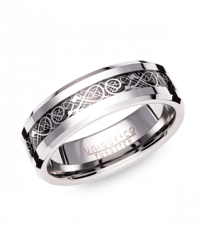 This stunning ring is made from Tungsten Carbide for unbeatable strength and durability. Silver IP plated ring with polished finish and a black centre patterned with a Celtic design. Perfect as a wedding ring or dress ring.