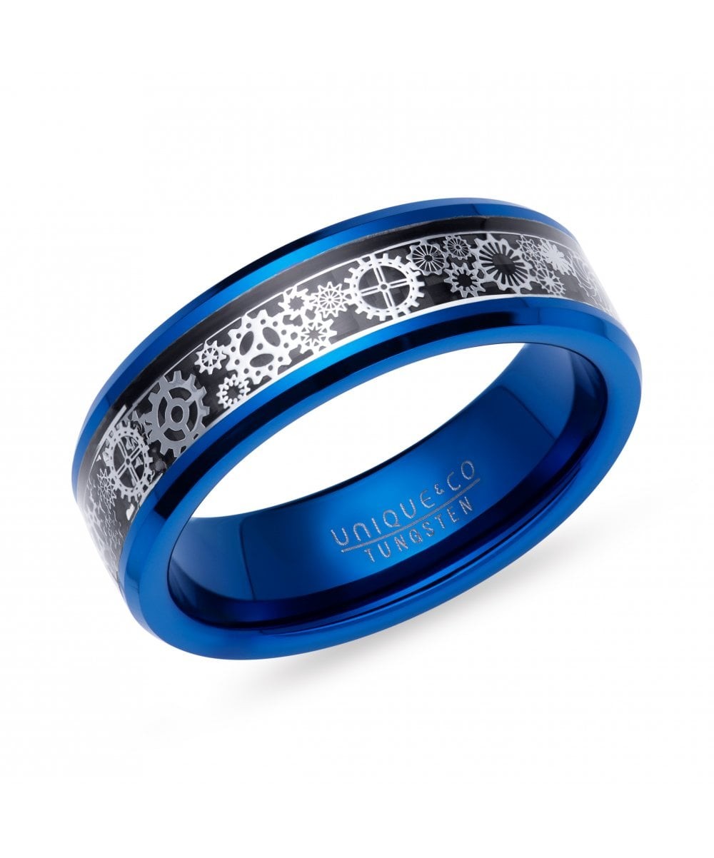 This stunning ring is made from Tungsten Carbide for unbeatable strength and durability. Blue IP plated ring with polished finish and a black centre patterned with a Cogs design. Perfect as a wedding ring or dress ring.
