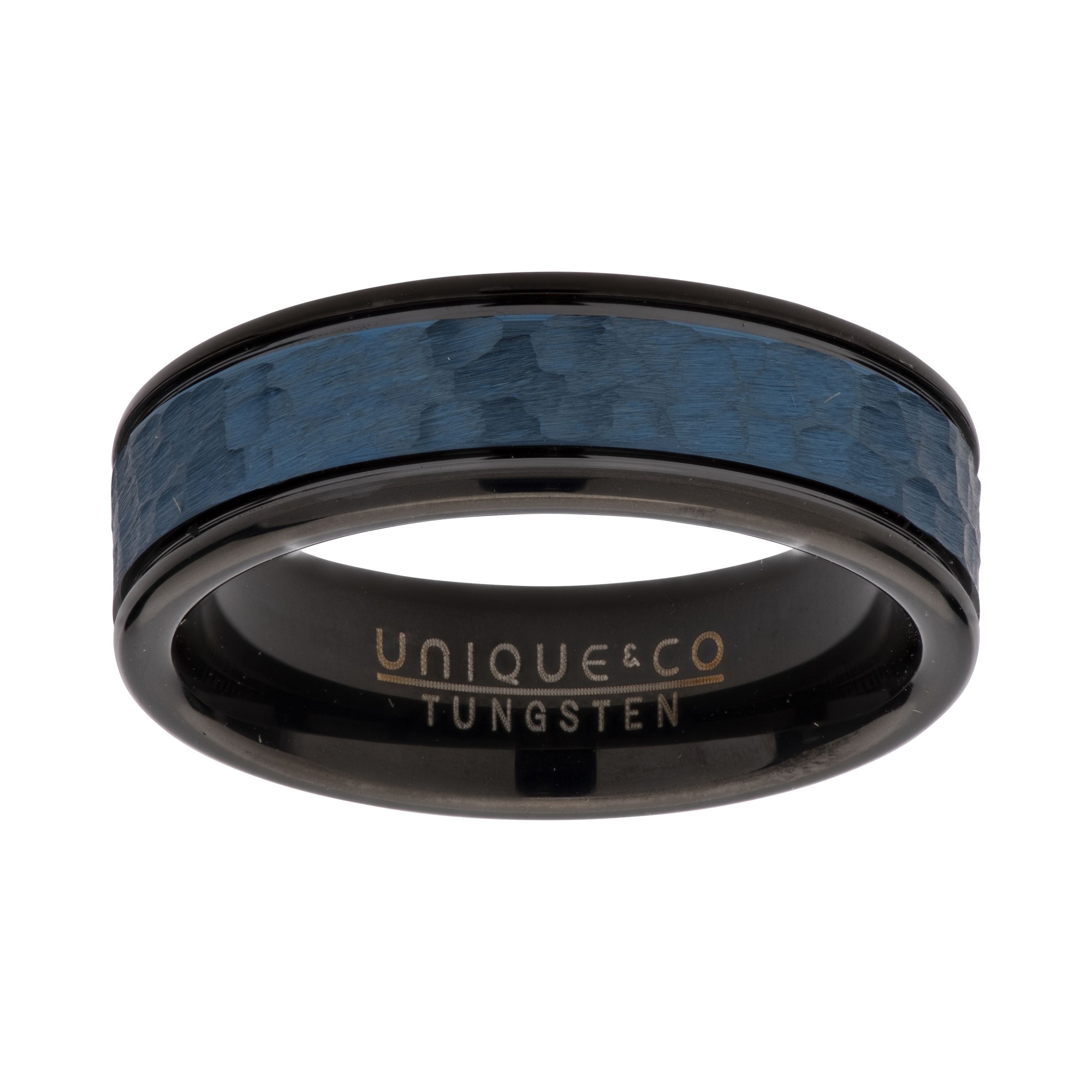 Tungsten Carbide Hammered Black & Blue 7mm Ring