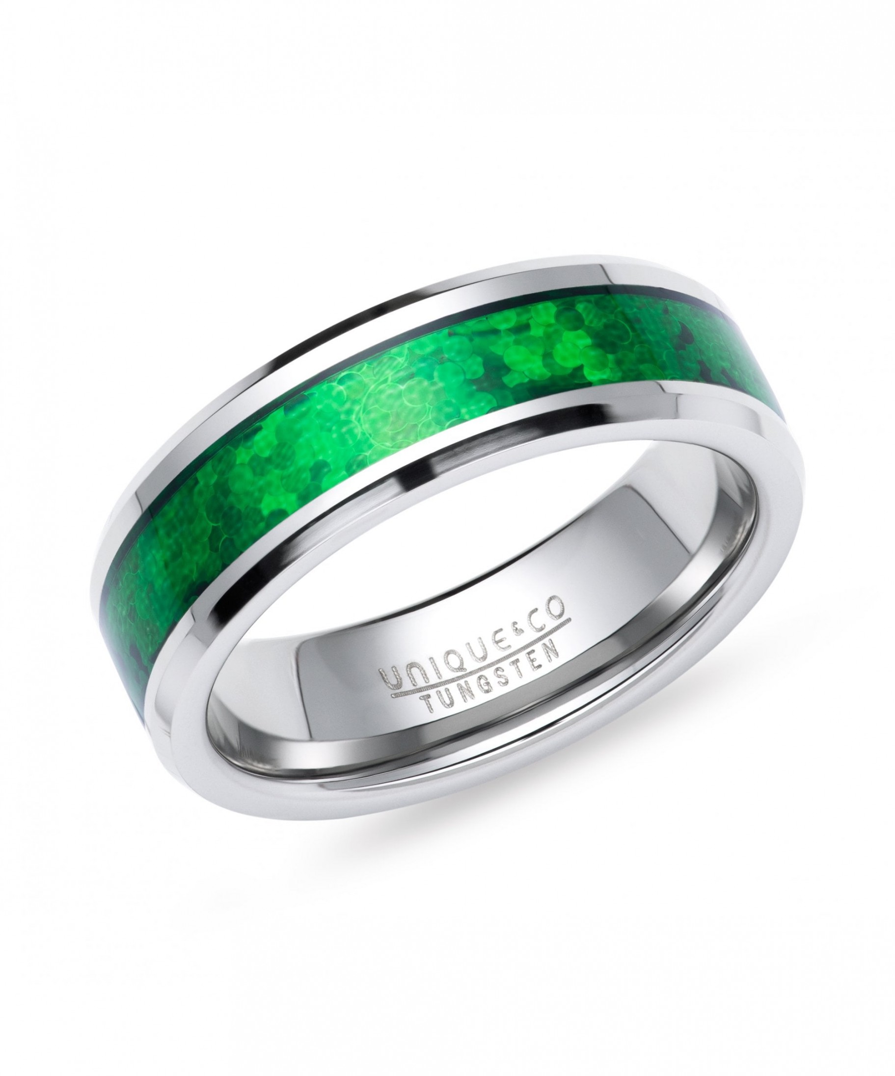 This stunning ring is made from Tungsten Carbide for unbeatable strength and durability. Polished finish with a green carbon fibre patterned centre & bevelled edge. Perfect as a wedding ring or dress ring.