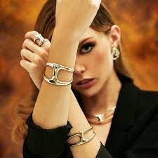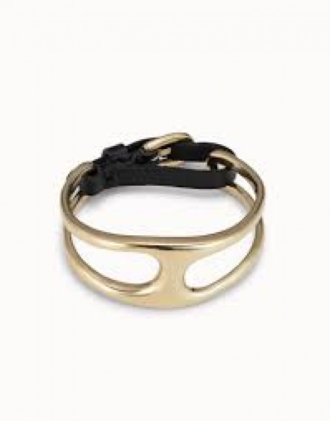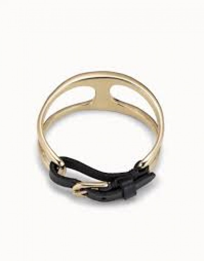 Gold-plated metal small stirrup bracelet with adjustable brown leather buckle clasp.