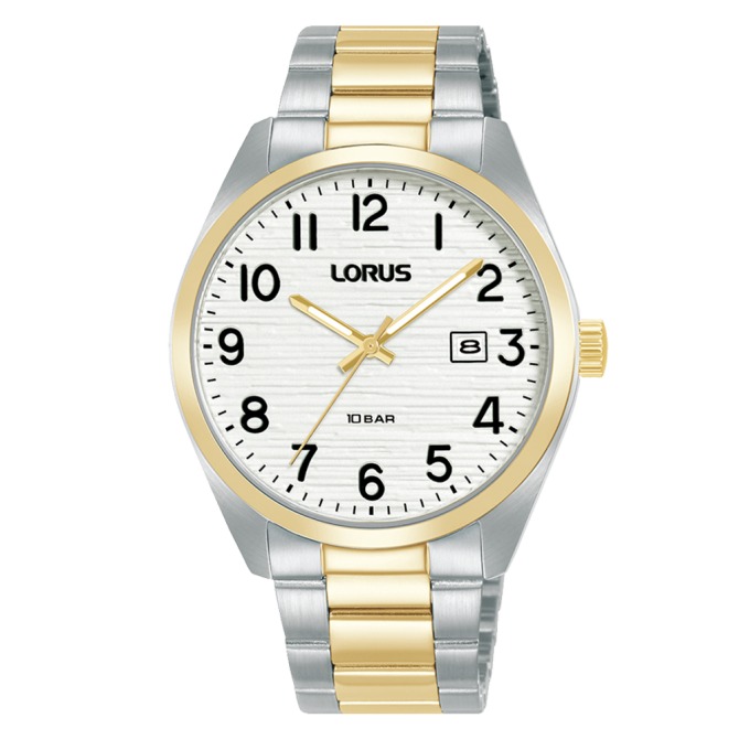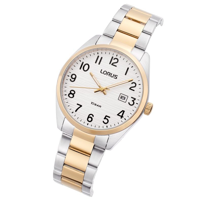 Water-resistant up to 100 metres, it’s suitable for swimming, diving and everyday splashes whilst luminous hands and markers on the pressed pattern dial guarantee legibility in dimly lit conditions. The date display feature brings everyday convenience being easily read on the wrist, whilst the two-tone silver and gold coloured case and bracelet enhance its elegant appeal.
