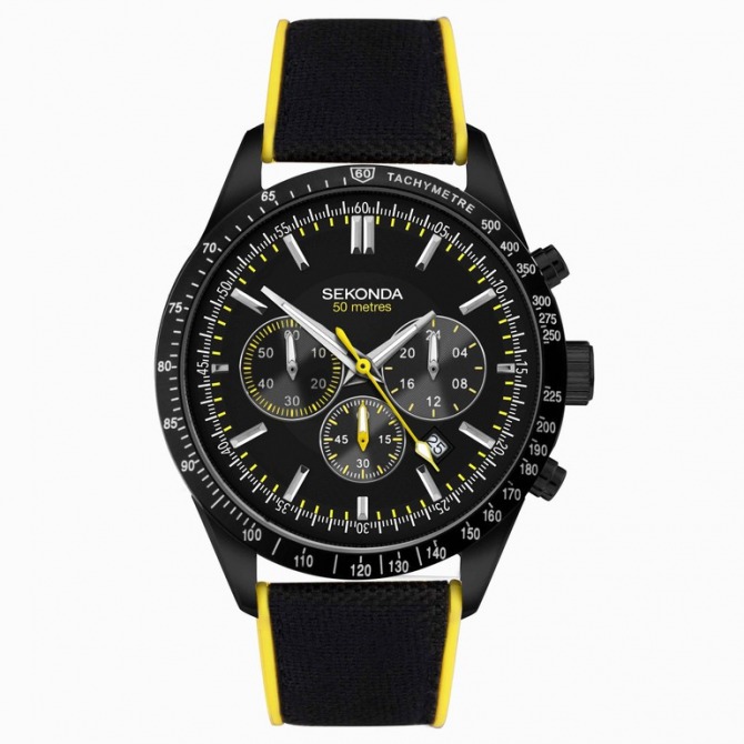 This watch has a round, black stainless steel case with a black bezel and tachymeter markings, with a black dial. Fastened with a black canvas strap, features include 1 second chronograph timing up to 1 hour, 24 hour read out, a date display and up to 50 metres water resistance.