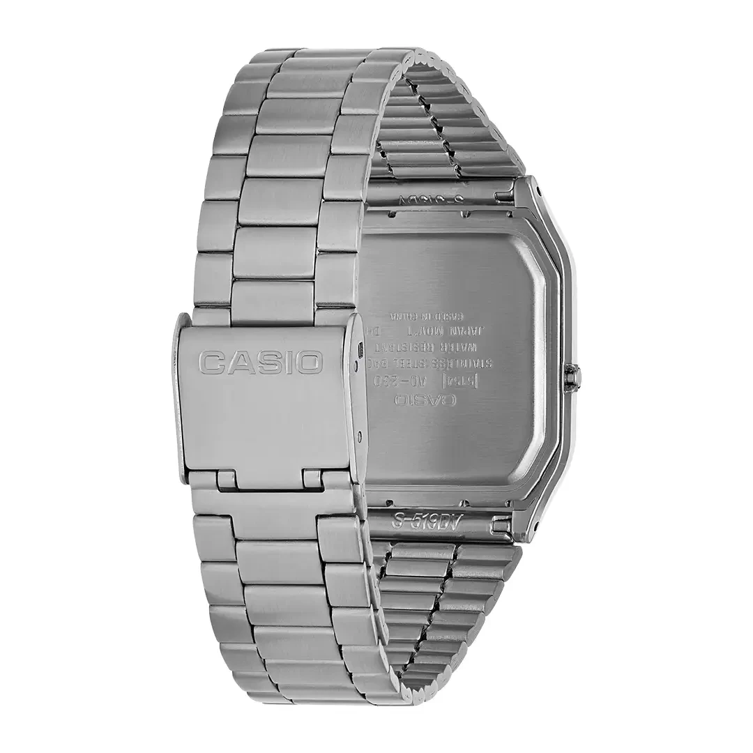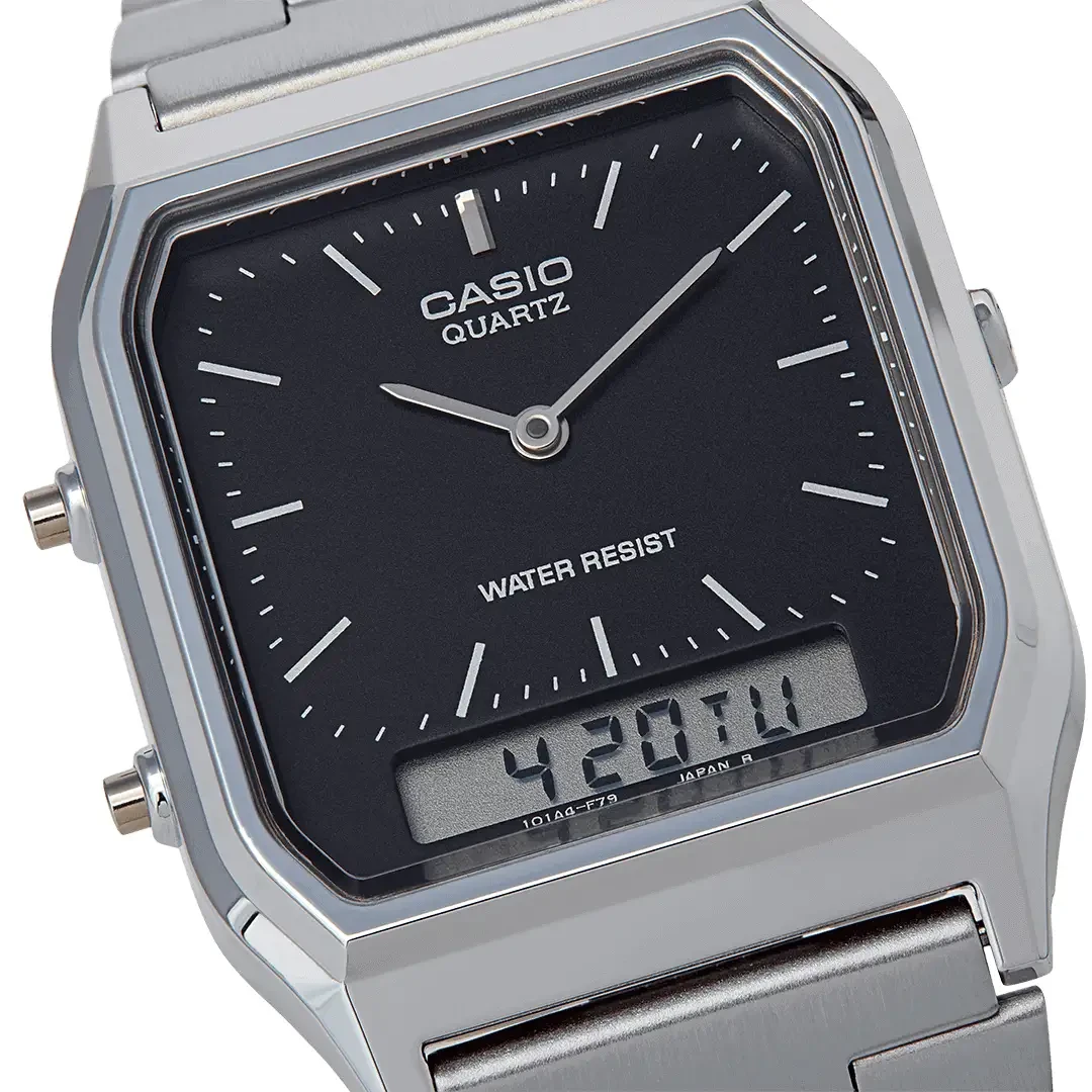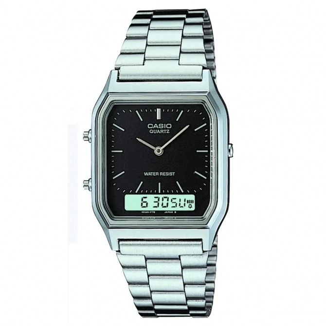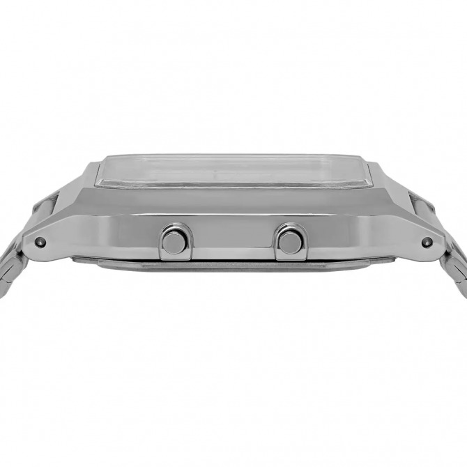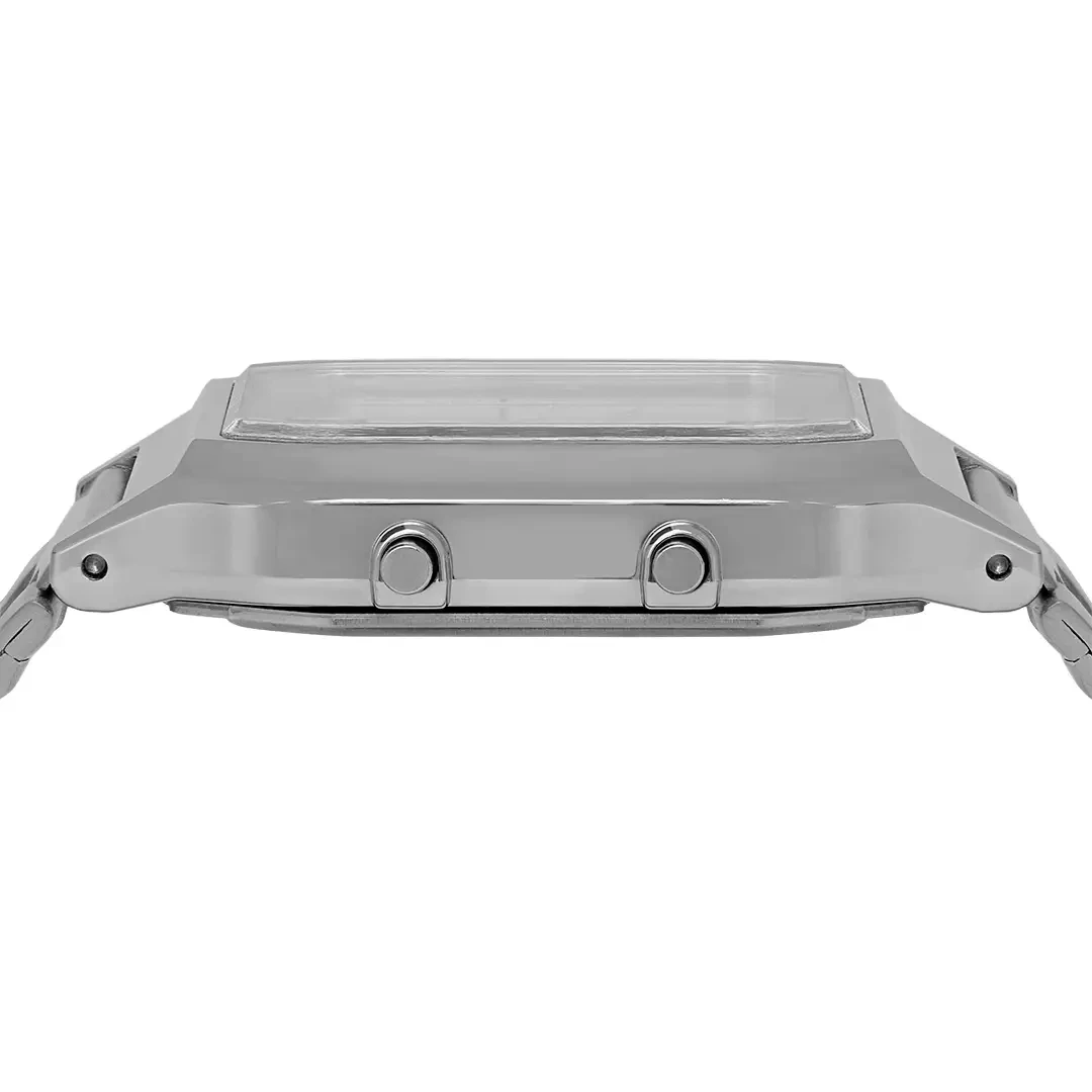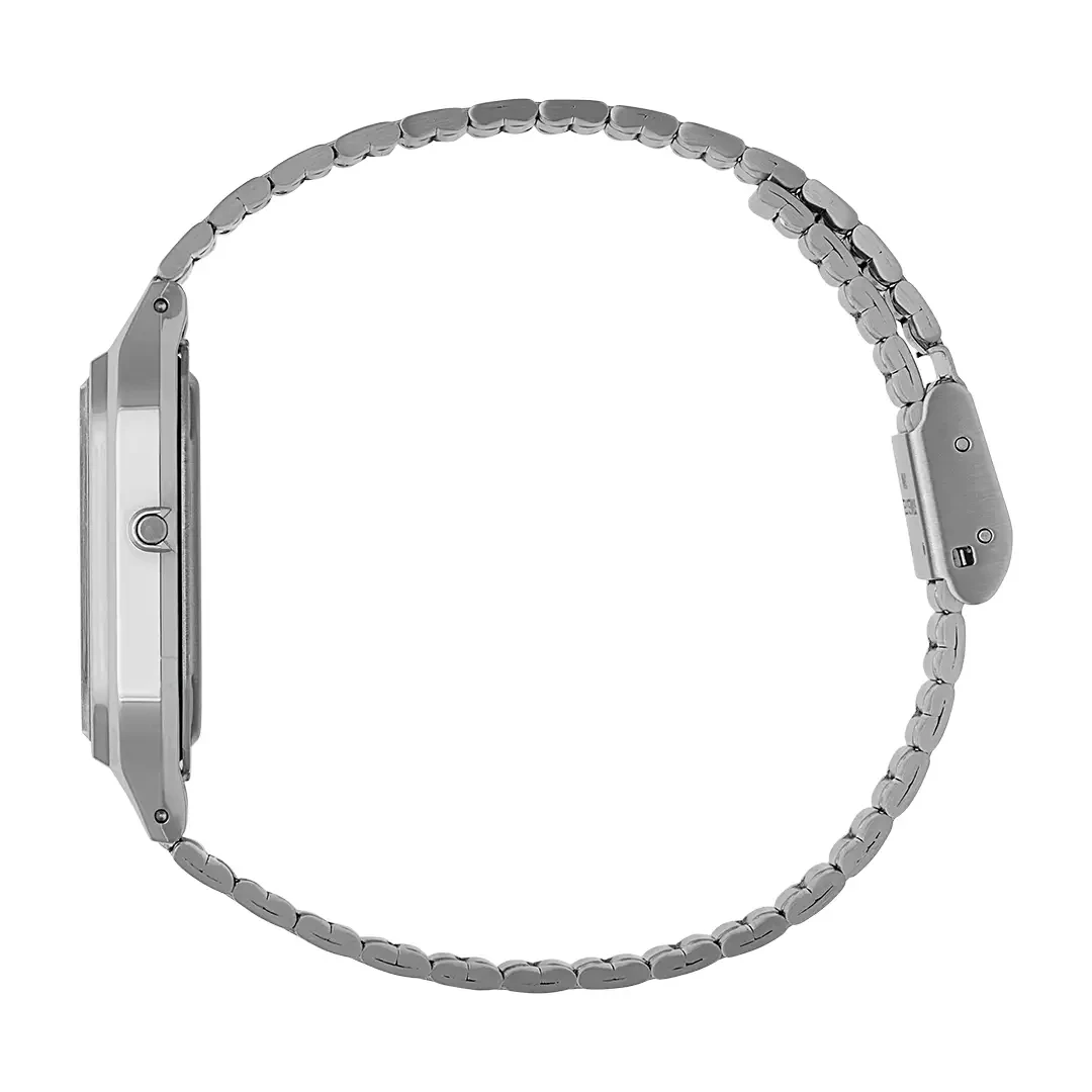 This timepiece features a digital and analogue display, dual time mode, a stopwatch and useful alarm. It is resistant to minor splashing and perfect for everyday wear. A silver coloured band completes the look.
