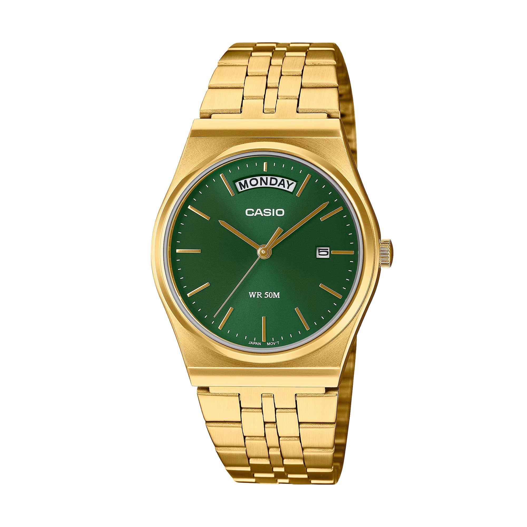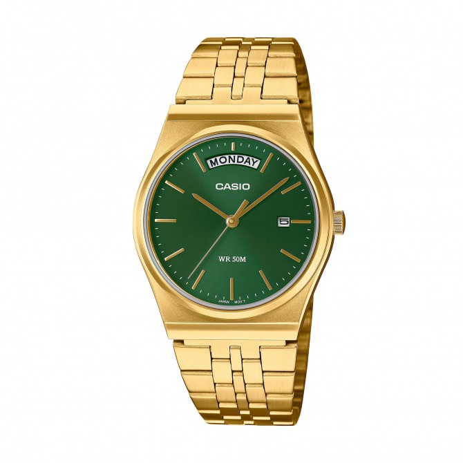 Introducing the newest retro - inspired addition to the Casio MTP collection now with bold colour accents. The day display at 12 o’clock gives it a distinctive edge and the clean, minimalist dial offers both a bold fashion statement and easy readability.