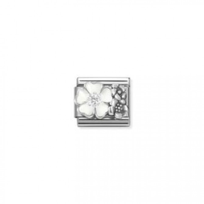 Original Nomination Classic Link in stainless steel with raised Flowers with White Enamel and CZ symbol in sterling silver. Vintage effect achieved with artisanal oxidation treatment of sterling silver. The White enamel on the main flower and the white Cubic Zirconia are applied by hand. This is a unique piece of jewellery that will add a touch of romance to your bracelet.