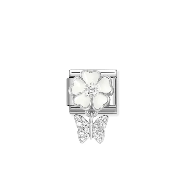 Original Nomination Classic Link in stainless steel with sterling silver White Flower with CZ and CZ Pavé Butterfly Pendant with White Cubic Zirconia. All the details on this jewel are finished by hand. This Link is shining with the new light of Spring!