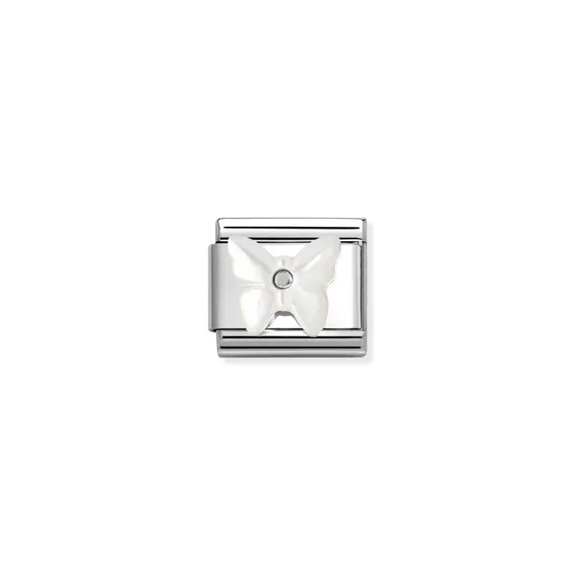 Original Nomination Classic Link in stainless steel with raised Butterfly symbol in White Mother of Pearl. The Butterfly is applied by hand. Pair this delicate Butterfly with other Links dedicated to Nature to create a bracelet that is personal and pretty.