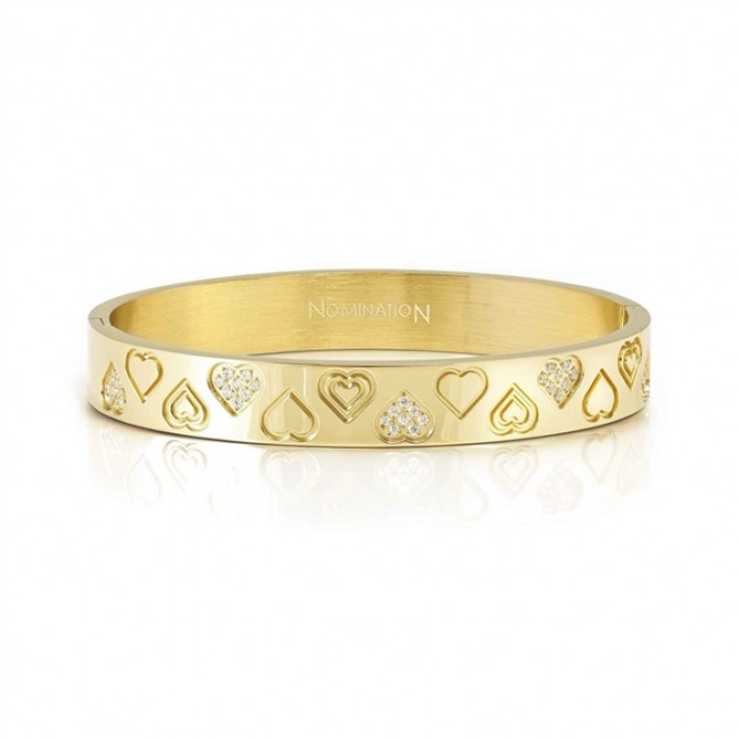This stainless steel bracelet with white Cubic Zirconia has an external satin finish in yellow PVD and is decorated with engraved Hearts and sparkling Cubic Zirconia. The satin finish on the inside of the bracelet creates an elegant contrast to the contemporary romantic design. This bangle is wider than other bracelets to make your look even brighter. Mix with other bangles for a gorgeous layered look.